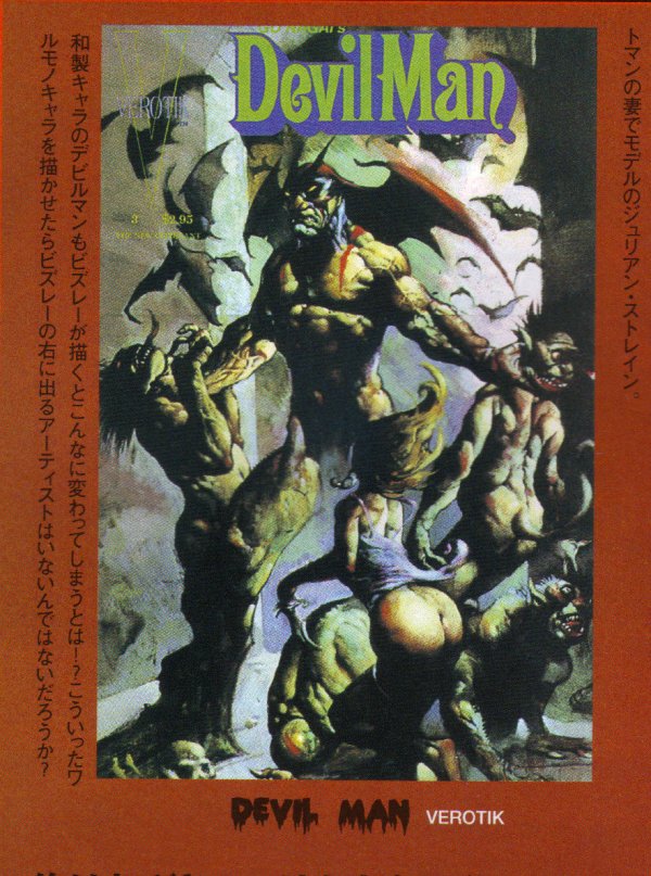 6月に出てたみたいで、ビズレーの本は持ってなかったので 先週買いました。 絵を描き始めたころはやっぱり人体、筋肉の勉強をやったので 人のイラストを見る時もムキムキのキャラが気になって、 フラゼッタとかビズレーの絵がいいな~と思ってみてましたねー。 絵を描き始めたころほどは筋肉が好き!って感じじゃなく なりましたがそれでもやっぱりビズレー見るとかっこいいな ーとおもいます、いやかっこいいというよりうまいなーって かんじですか。 この本もいつもどうりムキムキの男女、グロいモンスター、 以上、ていうかんじです。 けっこうグロいのがおおいのでそいうのはあんまり好き じゃないですが普通にかっこいい絵ももちろんあります。 ビズレーは塗りに関してかなりフラゼッタの影響うけてると 思いますが、この本見たらモチーフ的にももろフラゼッタ っていうのがありました。 やっぱりすきなんだなー。 この本は見たことない絵ばっかりだったのでなかなかいい買い物 だったかなと思います、ソフトカバーだし(ハードカバーの本 きらいなんです、見にくくて)。 そういえば、この本には載ってないですがビズレーが描いた デビルマンのコミック(表紙だけかも)があるみたいなんですが、 だれかもってないですかね~? これはむかしでてたトイ雑誌にビズレーのインタビューがあって そこに表紙の写真がのってたんですが、すごい気になります。 見たい。 どうでもいいけど、最後にのってるビズレーの写真。 さわやかだな~。 むかしはこんなだったのに。